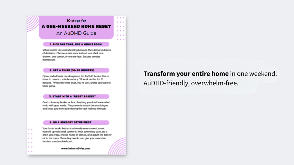 If getting organized always feels overwhelming, this guide is your new secret weapon. Designed specifically for AuDHD brains, it turns a full home reset into ten clear, doable steps you can complete in a single weekend, without burnout, decision fatigue, or the usual “where do I even start?” freeze.