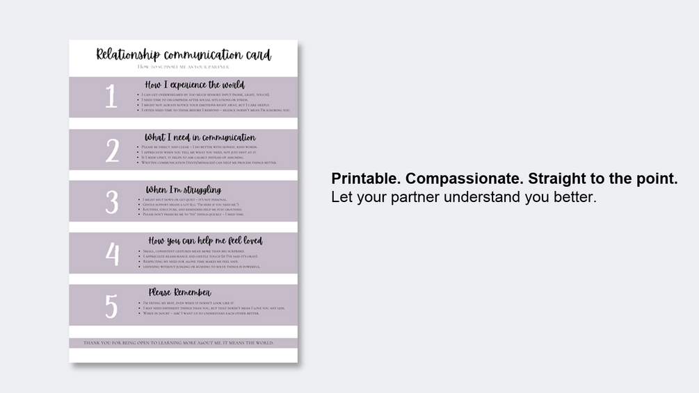 Struggle to explain your needs in relationships? This beautifully designed Communication Card – Relationship Edition is here to help. Created with neurodivergent people in mind (including those with ADHD, autism, AuDHD, sensory sensitivities, or anxiety), this printable guide makes it easier to express your emotional, sensory, and communication needs to a partner – without overwhelm or conflict.